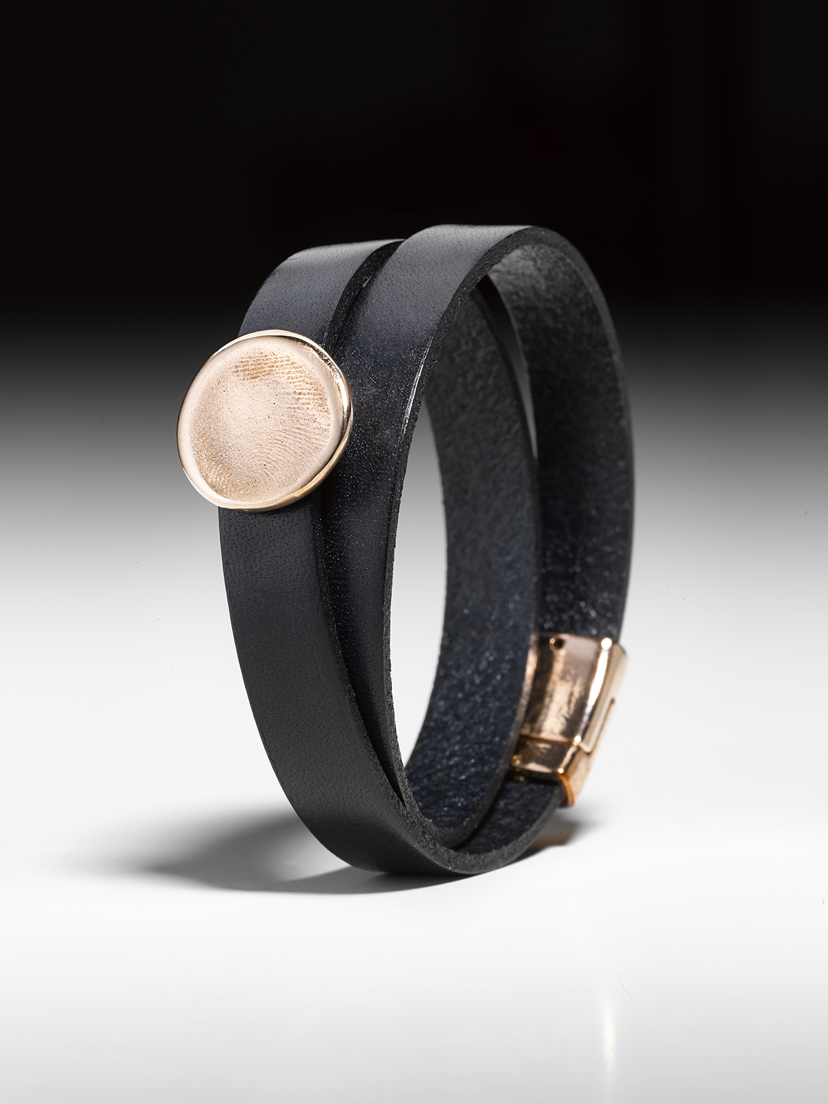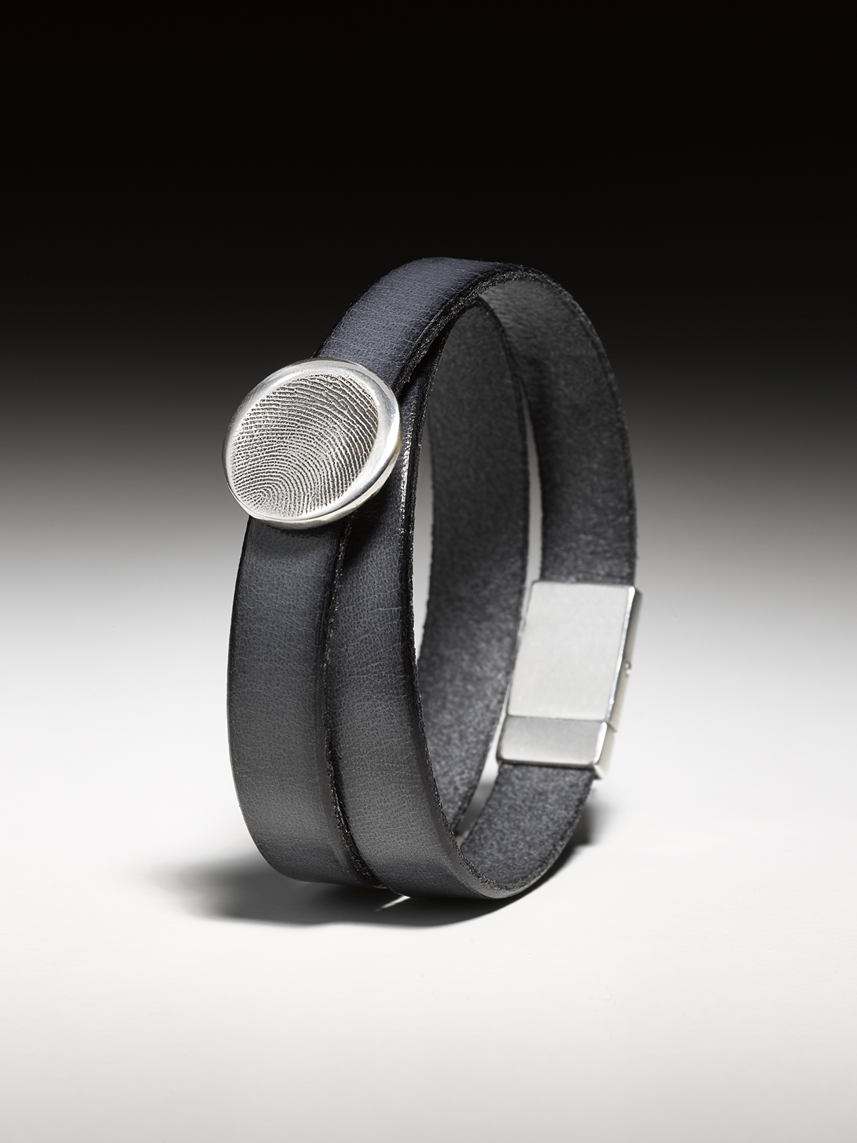 Edles Rindsleder mit Fingerprint-Nugget aus Feinsilber (1,7 cm im Durchmesser) und versilberten Magnetverschluss.