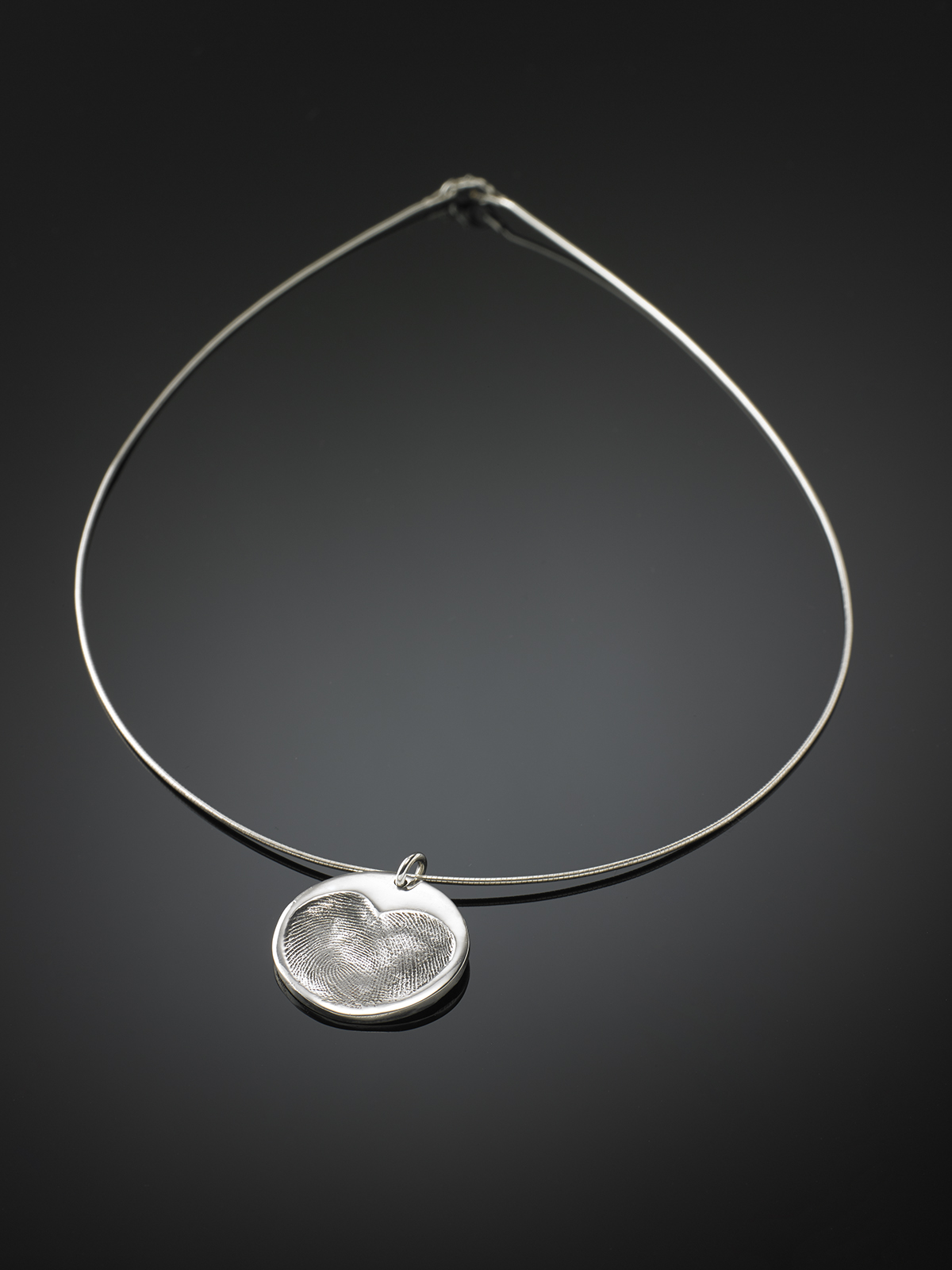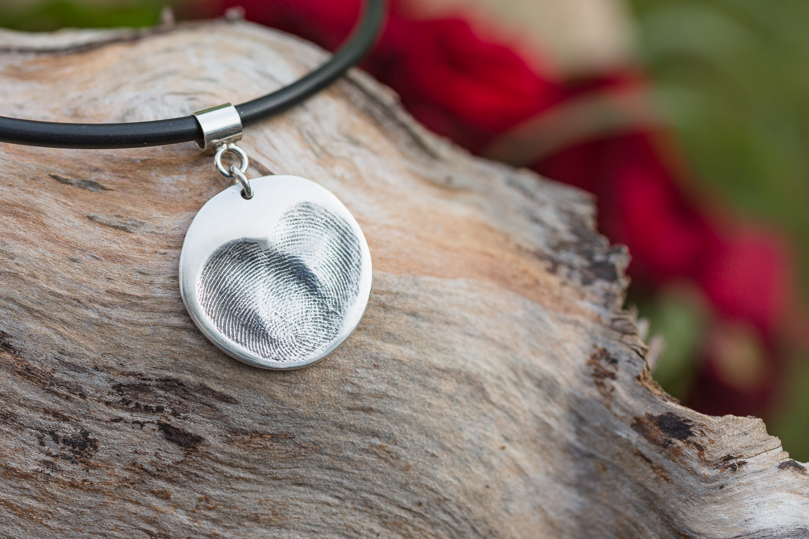 Silberkette mit einem Feinsilberanhänger (2,5 cm Durchmesser) und zwei Fingerprints in Herzform wenn gewünscht. Auf diesem Anhänger können sich 2 Personen zusammen verewigen.