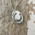 Ovaler Kettenanhänger mit Hufabdruck in Feinsilber inkl. Silberkette nach Wahl. Auch mit einem ein Kautschuk- oder Ledercollier erhältlich. Maße: 2,7 cm hoch und 1,9 cm breit. Vorerst können wir nur Abdrücke von Pferden, die Hufeisen tragen, verarbeiten.