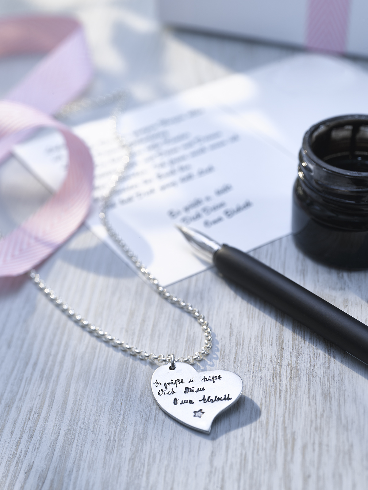 Personalisierte Kettenanhänger in geschwungener Herzform mit handgeschriebenem Text und Fingerprint auf der Rückseite
