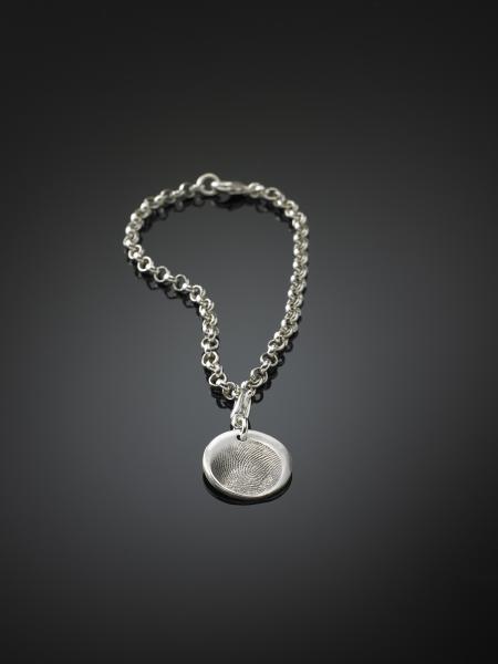 Bracelet in sterling silver with a round fingerprint charm in fine silver.